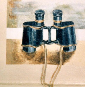 Dot loved her binoculars. Through them she looked at anything and everything. She looked at the sky and the clouds, the moon and the stars. If she saw a bird in flight, she followed it until it flew out of sight. She looked at herself in the mirror and at her feet as she walked; at her sister as she ate tuna fish from the can and as she put on lipstick; at squirrels as they played underneath the trees and the tom cat as he walked slowly from the shed to the house and back again; her mother as she slept in the bed and as she stirred soup on the stove; Toots as he cracked walnuts or pushed a wheelbarrow full of fertilizer from one side of the yard to the other; cars on the road, coming toward her with startling clarity; the dog as it scratched its fleas; trains going by on the tracks behind the house.