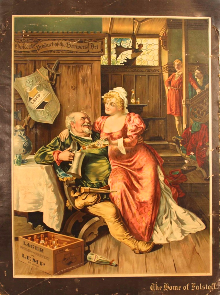 1907 advertising lithograph for Falstaff Beer, made at the Lemp brewery in St. Louis, Missouri. The Lemp family mansion is now a restaurant. The creepy Lemp brewery still stands in South St. Louis (used as a haunted house attraction around Halloween). The Lemps were a wealthy St. Louis family known for, among other things, being among the first to generate their own electricity in the 1880s.
