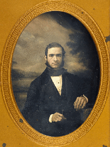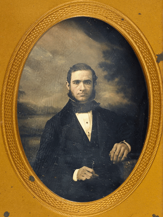 Daguerreotype of a seated man with muttonchop whiskers (1854)