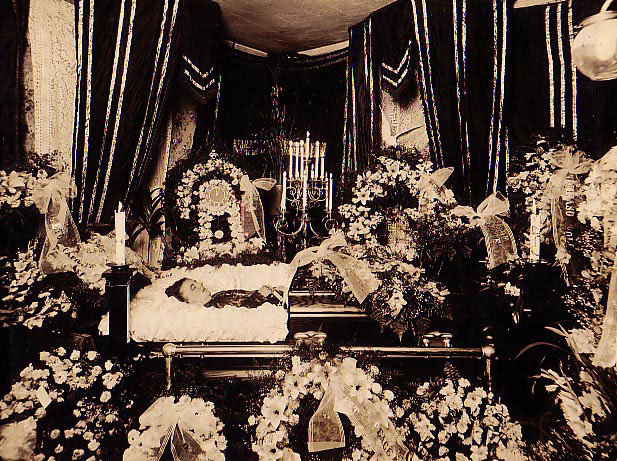 Later examples of postmortem photography show less emphasis on making the deceased appear lifelike and oftentimes showed him or her lying in a coffin. Many of these pictures were taken in someone’s home, as it was the custom to have the deceased lie in state at home so friends and relatives could gather to pay their respects and say their final farewells.