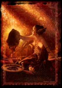 Salome danced seductively for the assembled guests but especially for King Herod. She swiveled her hips, put her arms in the air, moved her head from side to side. She used her veils to great effect to show off her face and her body. She bent forward and balanced herself on her hands; backward and joined her head with the floor as if she had no bones in her body. She shimmied and she shook. She moved all about the room so as to be seen by everybody; there was no eye that wasn’t upon her. She demonstrated a skill and dexterity that nobody believed her capable of.